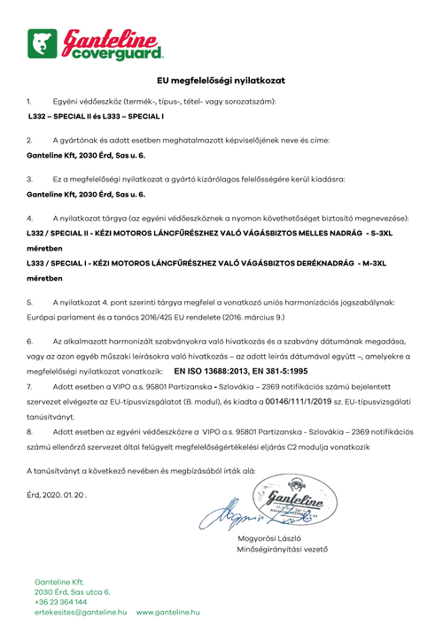 * az elejerészeken, a vállaknál és az ujjakon kilenc rétegű, aramidszálas vágásvédő betét