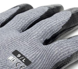 Szürke, 13-as kötésű, varrás nélküli védőkesztyű, HDPE, poliamid és elasztán alapanyagból, tenyerén fekete sima nitril mártás, érintőképernyős használat, kötött mandzsetta.
