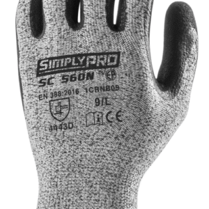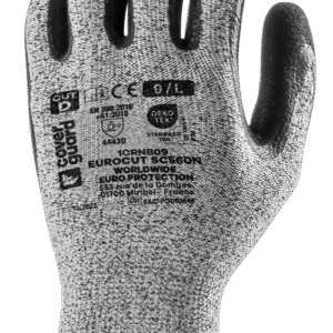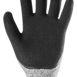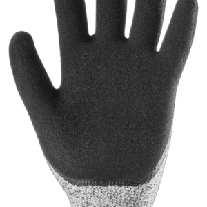 Szürke, pettyezett, HPPE-vel, sáványi szálakkal, poliamiddal és elasztánnal erősített varrás nélküli kesztyű.