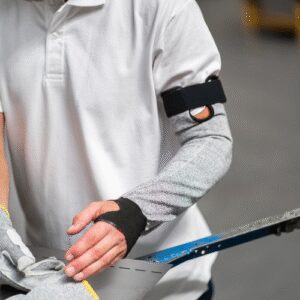 C színtű TDM vágásbiztosságú, 13-as kötésű, multiszálas (HPPE, szintetikus szálak, poliamid és elasztán alapanyagú) 45 cm hosszú karvédő