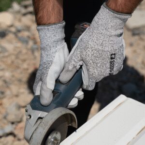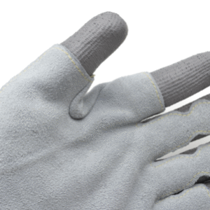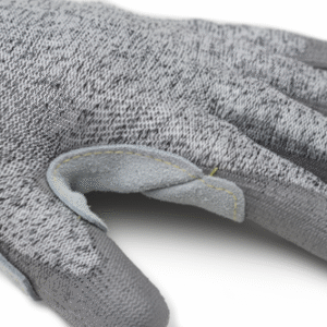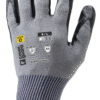 13-as kötésű, HDPE / poliészter kesztyű, tenyerén és az ujjakon szürke PU bevonat és bőr megerősítés, a hüvelykujj és a mutatóujj kivételével;