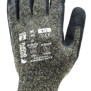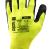 EUROHEAT CUT F 10-es kötésű, varrás nélküli sárga és fekete foltos kötött védőkesztyű, poli-pamut és aramid alapanyagból.