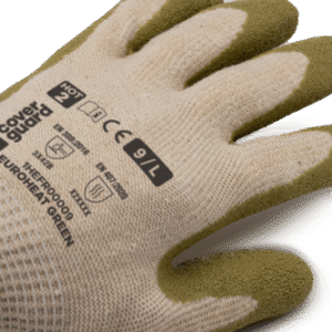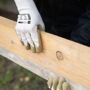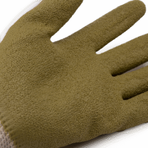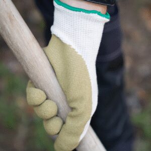 Fehér varrás nélküli, 13-as kötésű, alapkesztyű, pamut (56%), újrahasznosított pamut (19%) és poliészter (25%) alapanyagból, tenyerén olívazöld természetes latex mártás, kötött mandzsetta