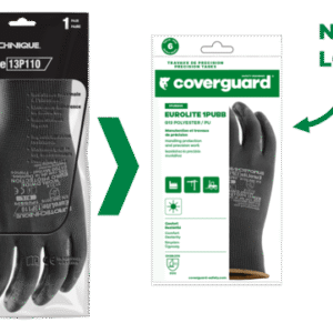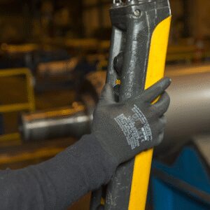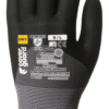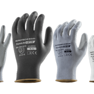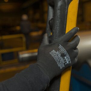 Fekete, varrás nélküli, poliészterrel erősített, 13-mas kötésű kesztyű, fekete poliuretánnal mártott tenyérrel és kötött mandzsettával.