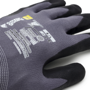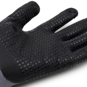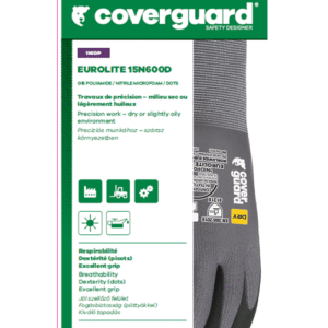 Szürke, varrás nélküli, poliamiddal megerősített, 15-ös kötésű kesztyű, tenyerén nitril mikro-habbal és pettyezve, kötött mandzsettával.