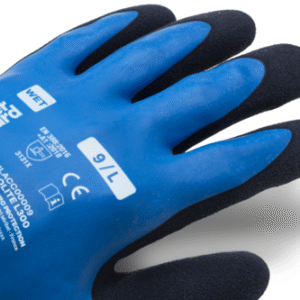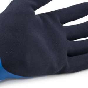 Kék latex-szel duplán mártott: Egy sima réteg amely teljesen fedi a kezet, egy másik réteg, amely a tenyeret és az ujjakat védi.
