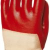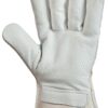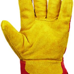 Sárga, marhahasíték rakodó kesztyű pamut/poliészter béléssel, piros tartós vászonnal a kézháton és a mandzsettán. Artériavédővel és 8cm-es biztonsági mandzsettával