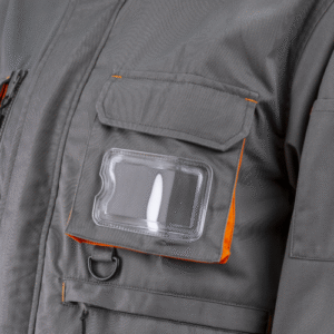 * állig érő húzózár, szennyeződésektől védő, tépőzáras cipzárfedővel, magas álló gallér* beépített névjegykártya-tartó ,egy rávarrt fedett felső zseb névjegykártya-tartóval , egy vízszintes cipzáros zseb bal oldalon és több praktikus zseb