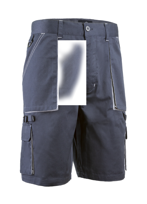 245 g/m2 vastag, kopásálló, lánckötésű anyag, 60% pamut, 40% poliészter, sötétkék-szürke díszítésű bermuda