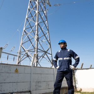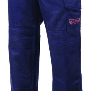 300 g/m2 vastag, 78% pamut + 20% poliészter és 2% antisztatikus alapanyagú sötétkék, vegyszer-, láng-, és íválló, antisztatikus, hegesztő védőnadrág,