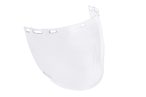 VISIFLEX víztiszta ívelt arcvédő látómező. nagy energiájú (190 m/s sebességű, 22 mm átmérőjű, 0,43 g súlyú fémgolyónak ellenálló) részecskék elleni védelem.